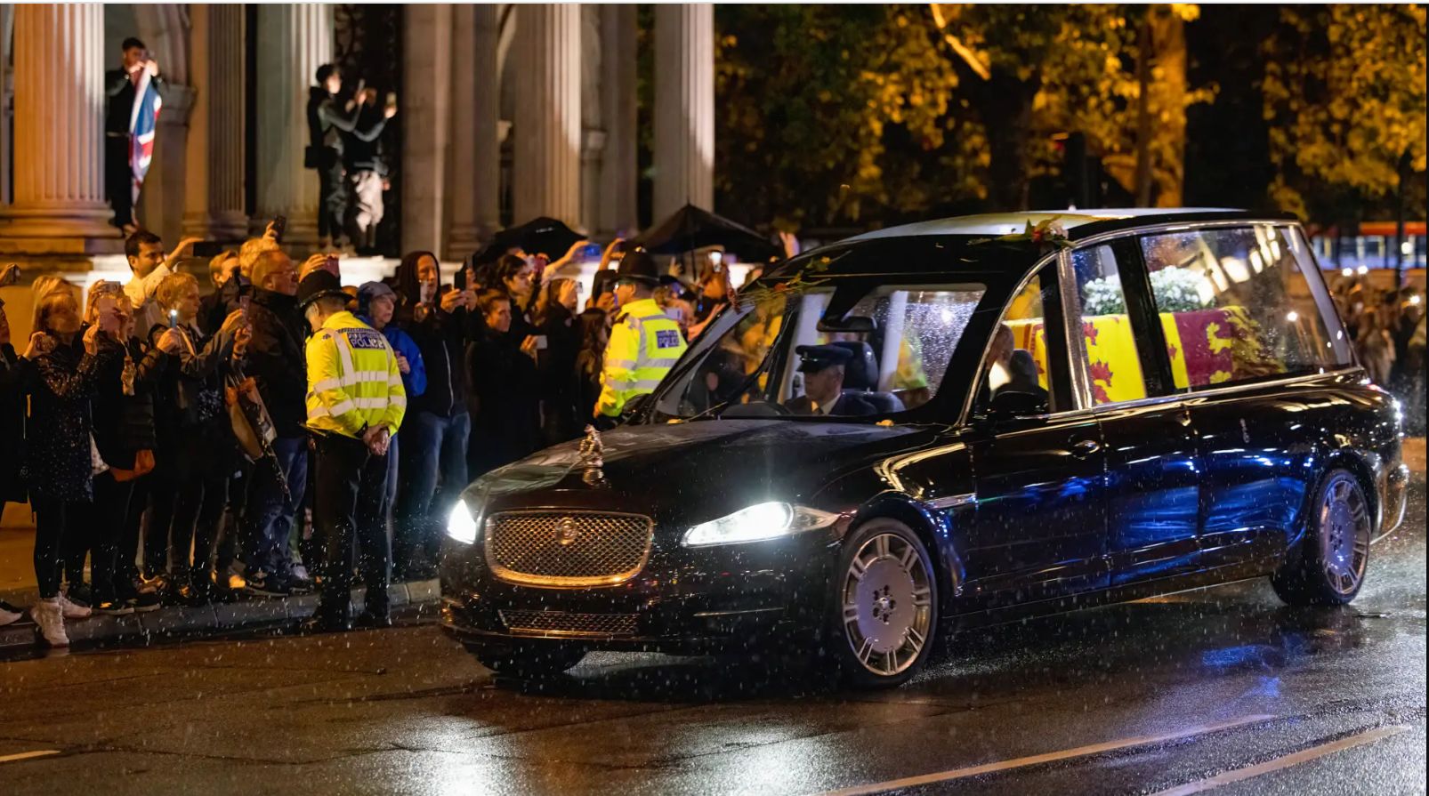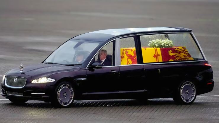 Kemudian, sesampainya di London, peti mati jenazah Ratu Elizabeth II langsung dipindahkan ke mobil jenazah Jaguar XF dengan logo khusus di kap mesin, mirip dengan Bentley State Limousine yang merupakan kendaraan dinas ratu semasa hidupnya.