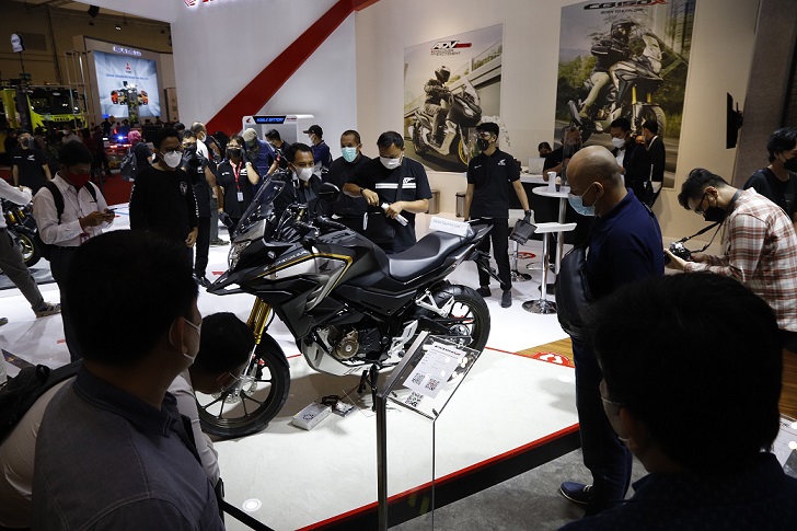 Suasana pengunjung pameran GIIAS 2021 berinteraksi dengan Honda CB150X. (AHM)